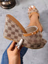 Apportez une touche d'élégance intemporelle à vos tenues estivales avec ces sandales compensées au design raffiné. Confectionnées en toile imprimée monogramme, elles sont sublimées par un détail en simili cuir camel avec une petite boucle métallique discrète, pour un style à la fois chic et décontracté.